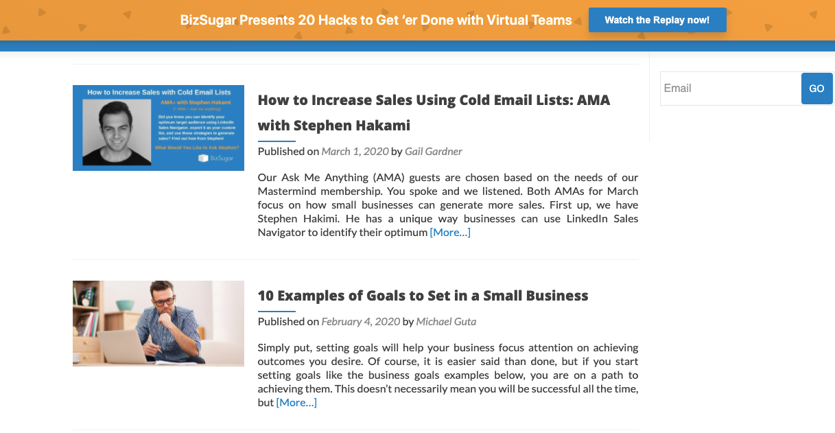Bizsugar is a blog for small businesses and freelancers offering advice in all aspects of managing a business. The topics range from sales and marketing tips, social media and blogging to goal setting, financing and loans.