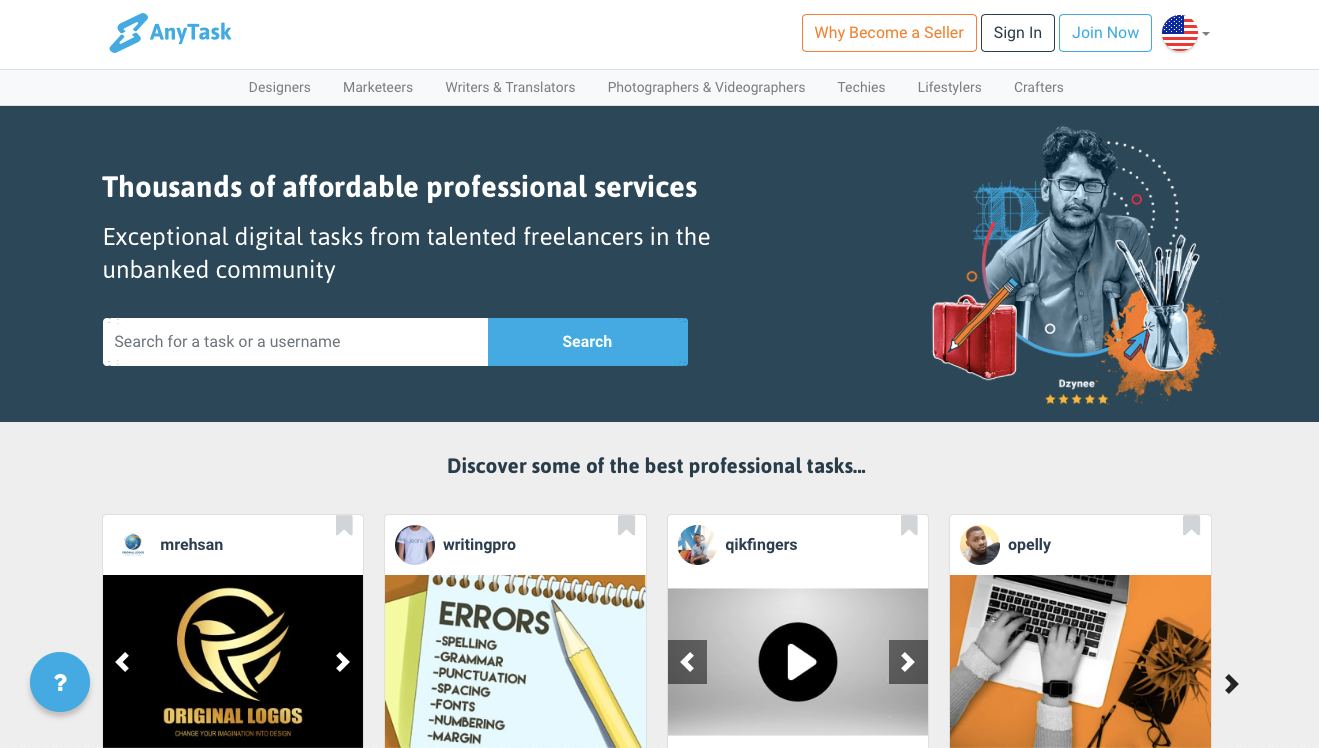 AnyTask is a newer freelancer platform. What is different about this platform is that you can register and offer your services without providing any debit or credit card details. Payment is taken from the buyer's card and is delivered to you in a cryptocurrency called Electroneum (ETN), so you don't even need to own a bank account. You can spend ETN in many different ways or convert it into your desired currency with an exchange agent.
