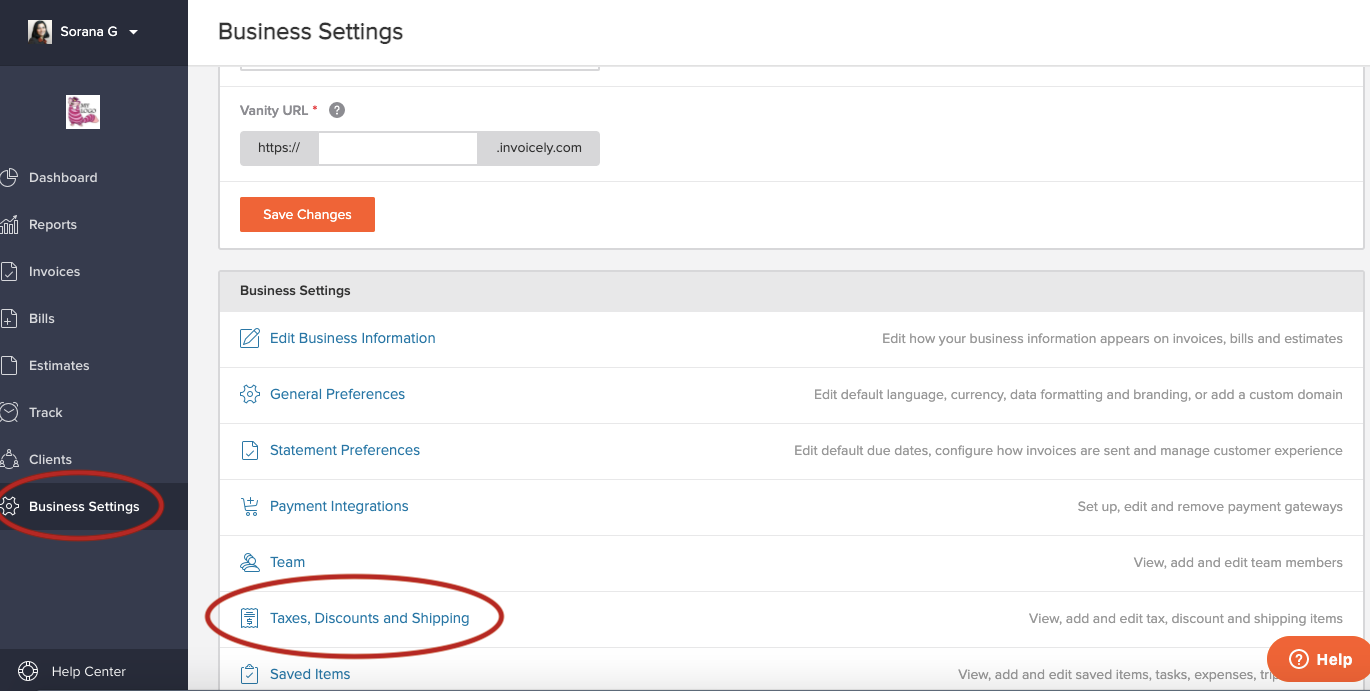 In the Business Settings screen, scroll down and click on Taxes, Discounts and Shipping.