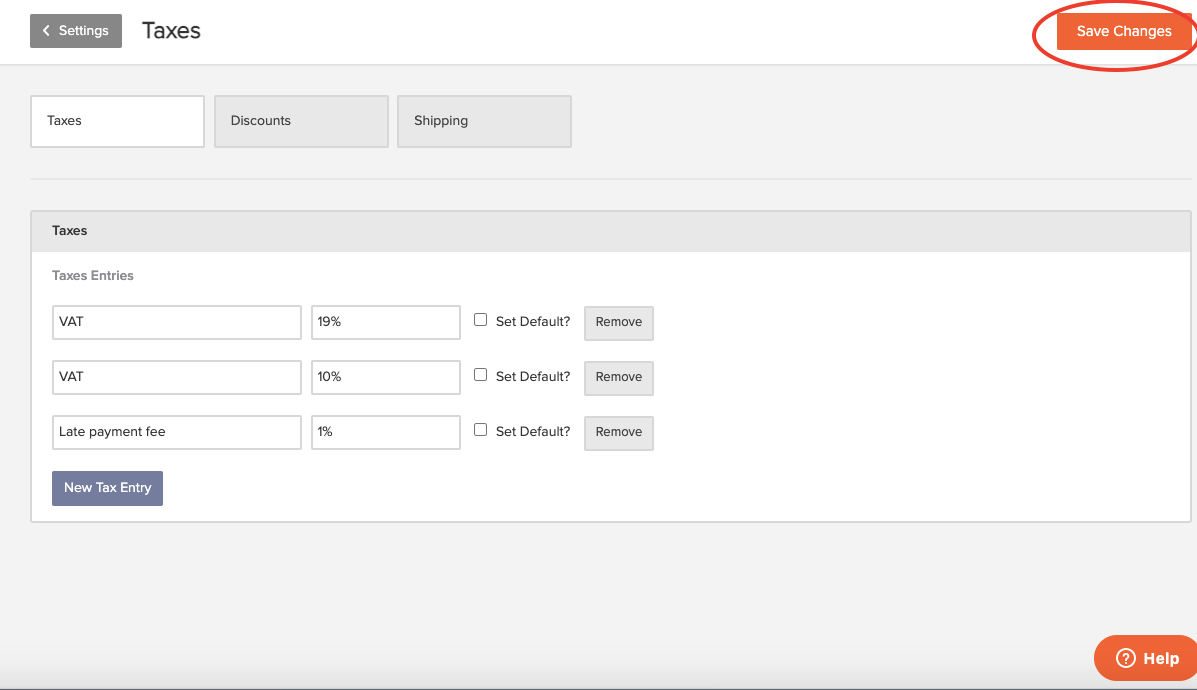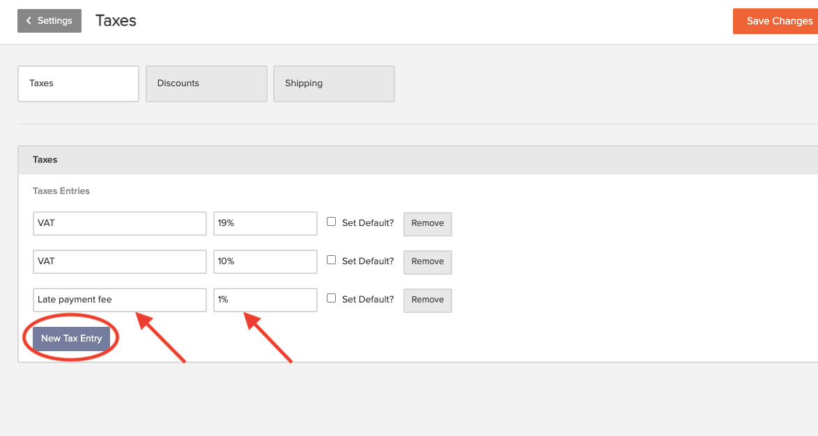 Next, click on the New Tax Entry box to create a new tax. Name your tax Late payment fee, as in the screenshot below and choose a percentage of the invoice amount. I chose 1%.