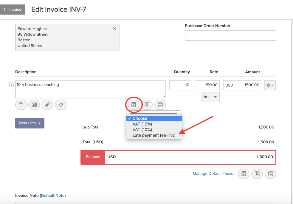 Now you can add the tax. Click on the tax icon (see screenshot below) and a dropdown menu with your saved taxes will appear. Choose the Late payment fee by clicking on it.