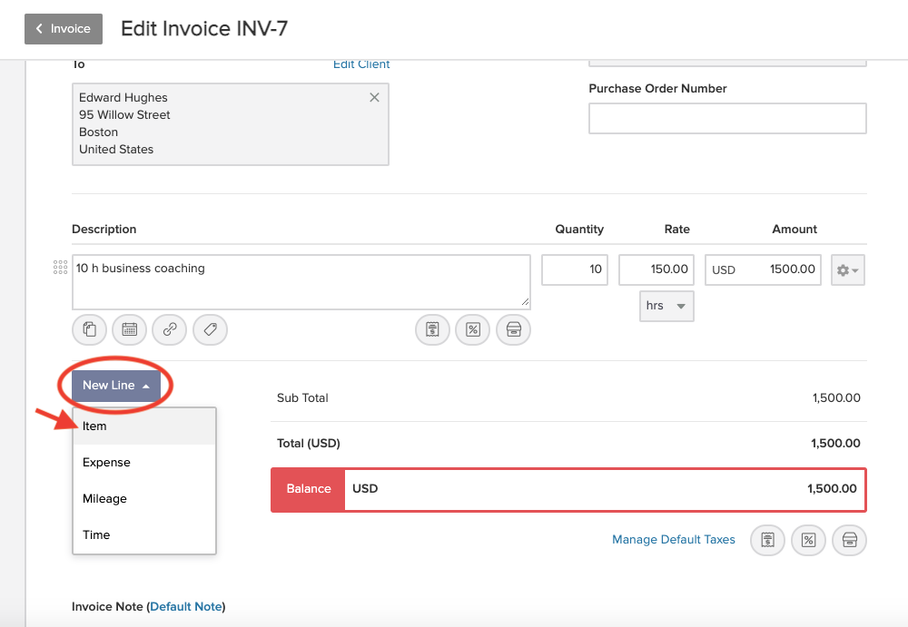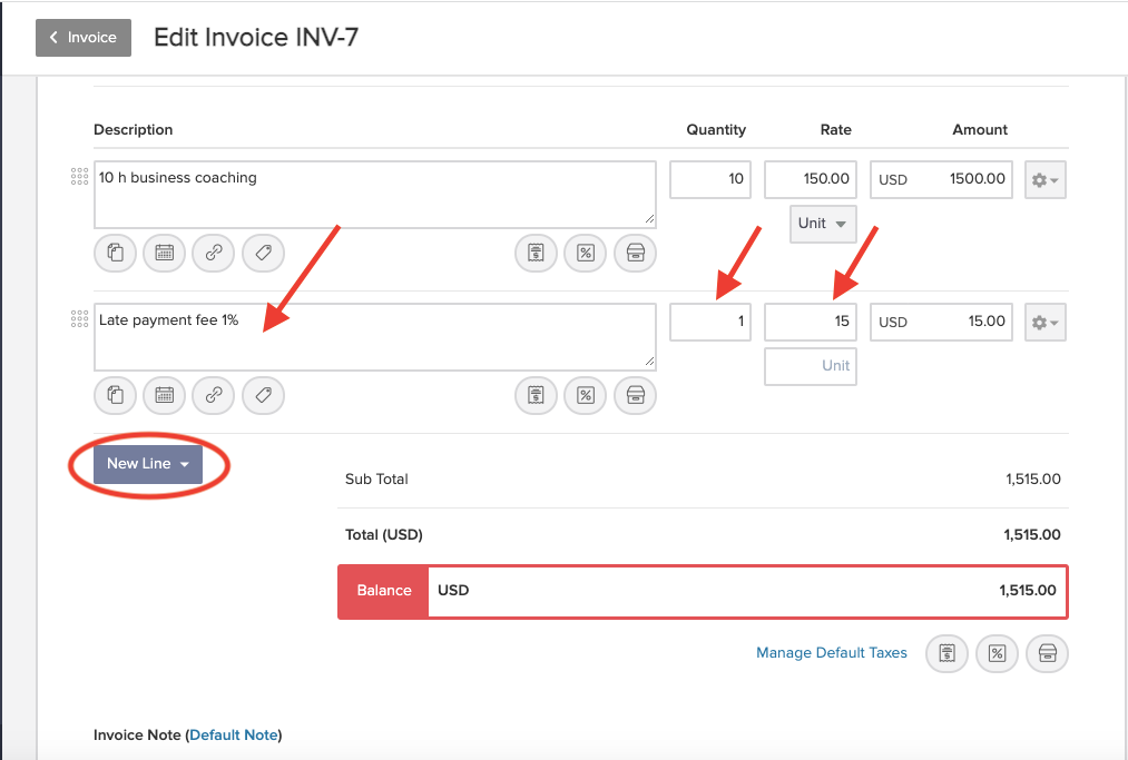 Now fill in the boxes for the new item: description (Late payment fee 1%), quantity (1) and rate (1% out of the invoice amount of $1,500 is $15)