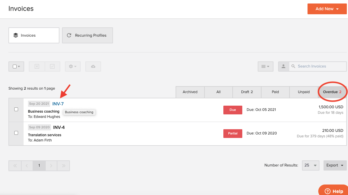You can also add the late payment fee as an item in the invoice. In order to do that, look for the invoice in the Overdue invoices list and click on it to open it.