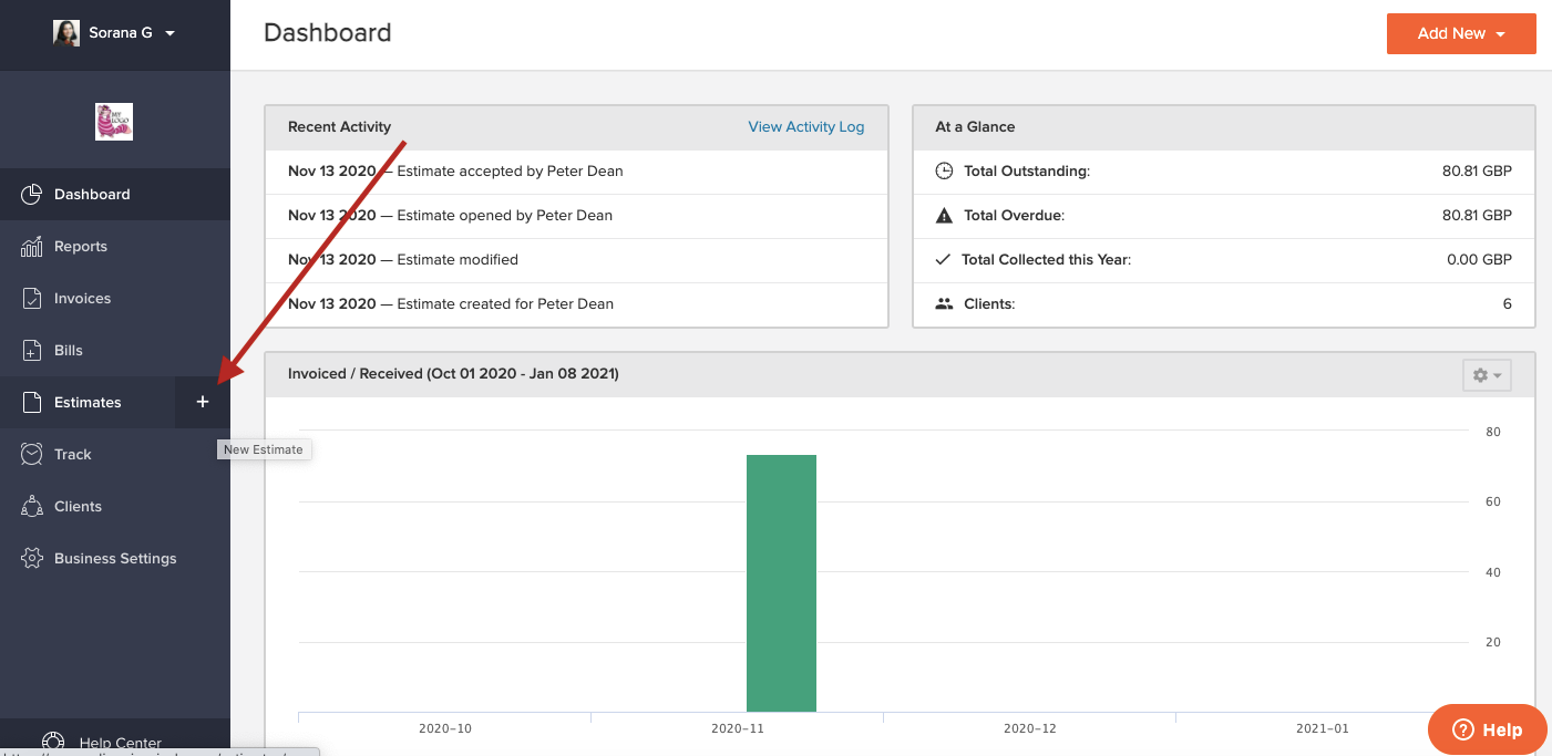 Let's say your company car broke down and you paid $264 for its repair. Now you want to create a bill for this expense, in order to have a record of it. From your invoicely dashboard, click on the plus sign next to the "Bills" link in the lefthand menu. (it appears when you hover over the "Bills" link, see image below).