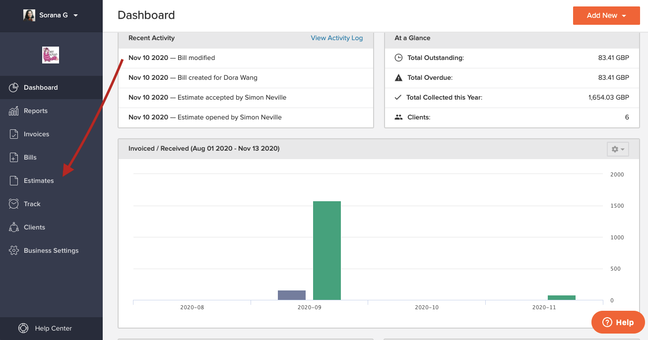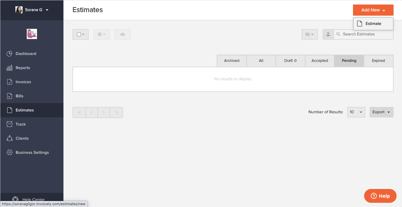 In the new screen, click on the orange "Add New" button in the upper right corner and then on "Estimate".