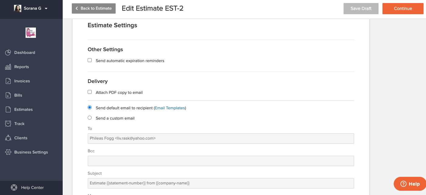 You also have additional options, such as changing the default footer (bottom left) or, by clicking on "Estimate Settings, Payment and Delivery" (bottom right), you can change the text of the email your client will receive, set expiration reminders or attach a PDF copy to the email.
