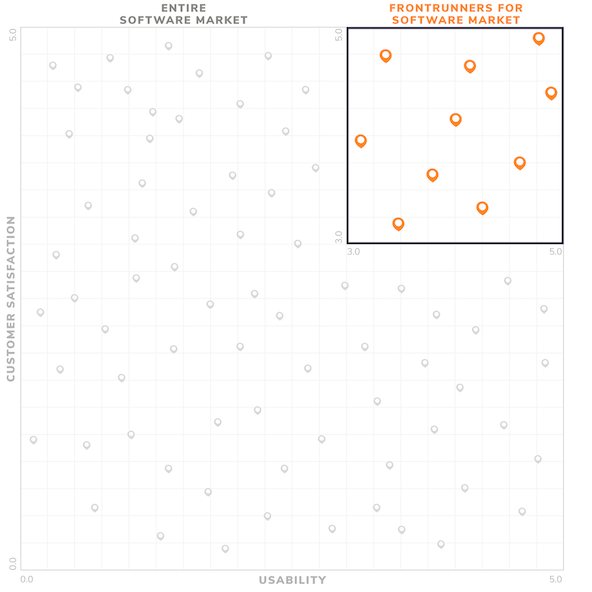 The FrontRunners methodology uses recent, published user reviews to score products on two primary dimensions: Usability on the x-axis and Customer Satisfaction on the y-axis.