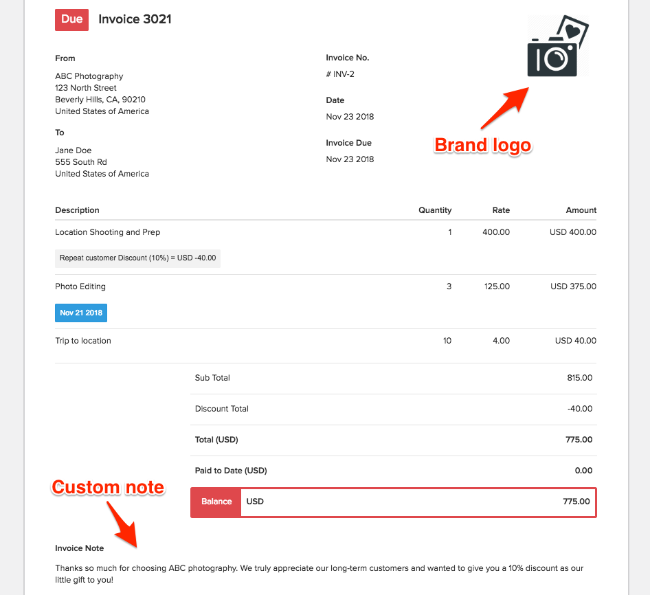 When you’re working with a quality invoicing platform, you can ensure all of your invoices come out beautiful and professional. You want your photography invoices to represent your brand.